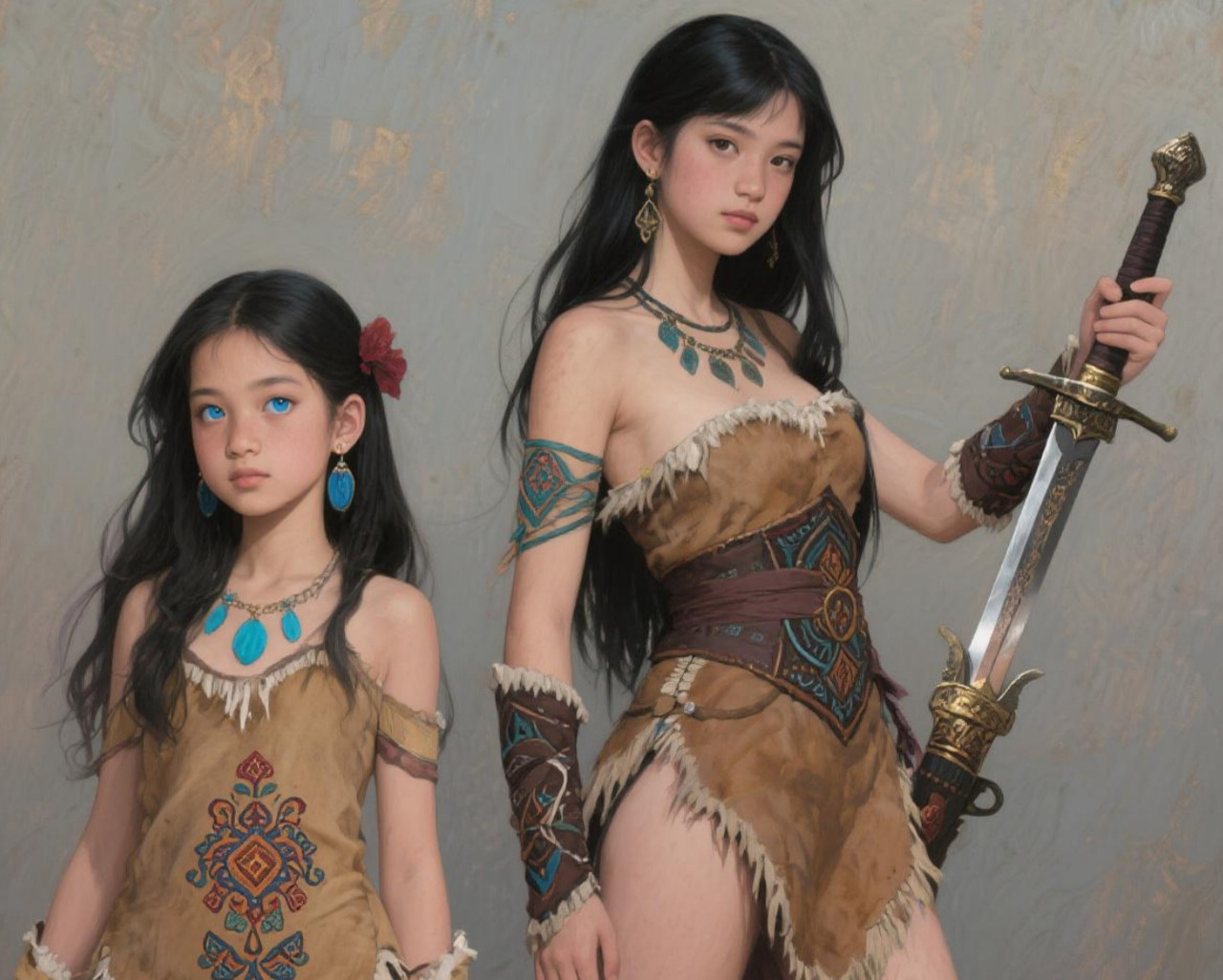 Повязка из сыромятной кожи или плетеная. На ней подвески, которые говорят о готовности к охоте. После замужества меняется на металлический, а на пояс полагается пряжка.