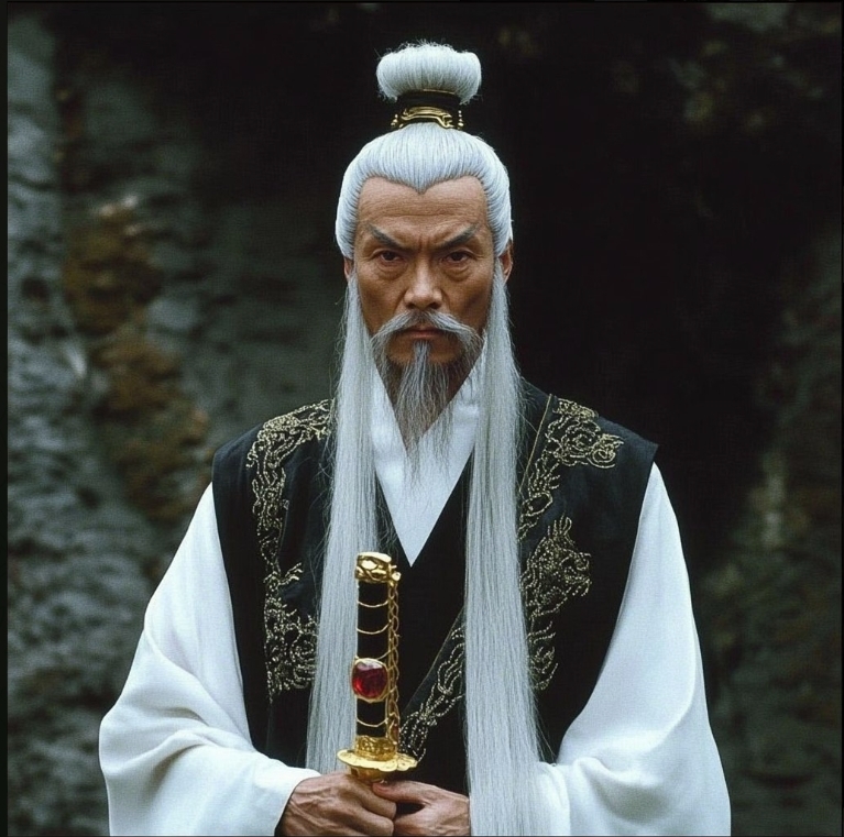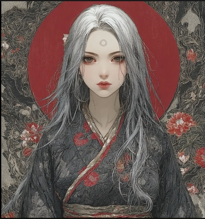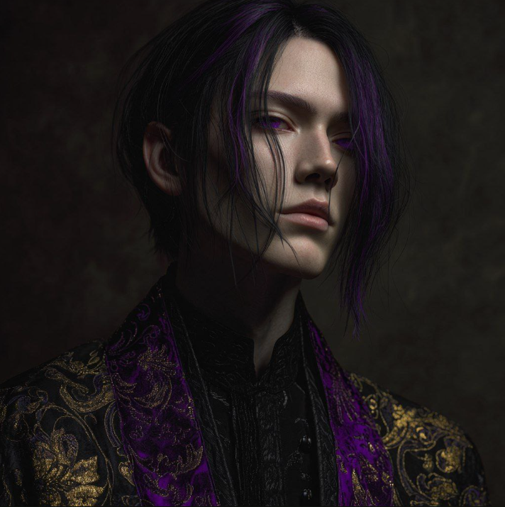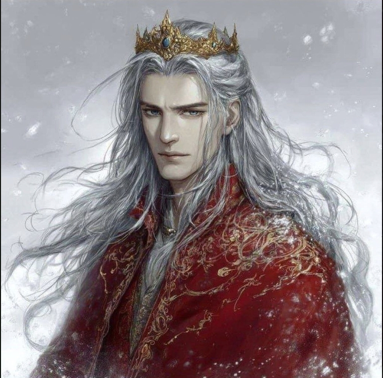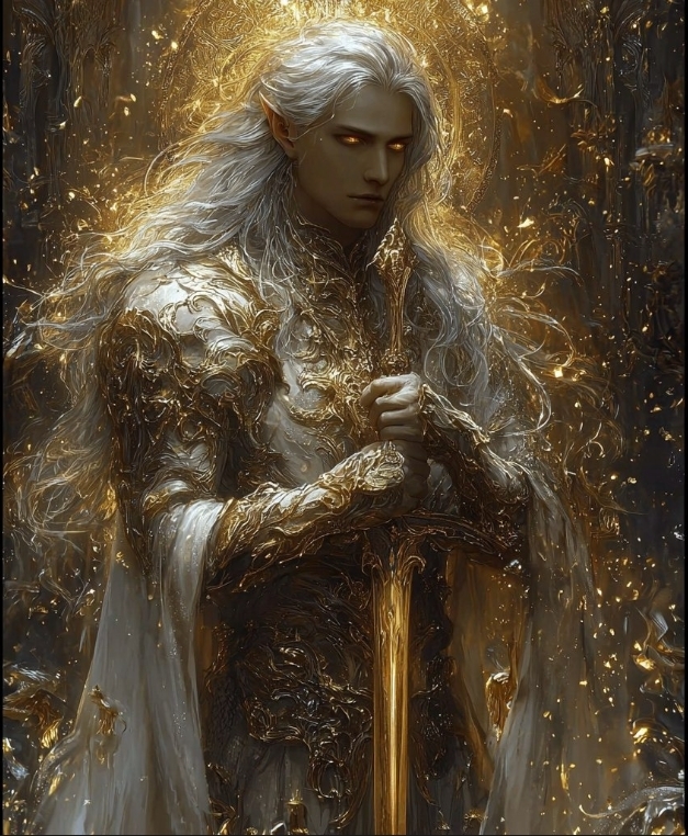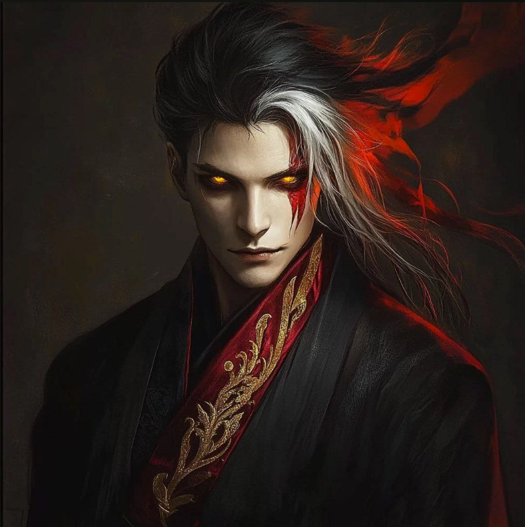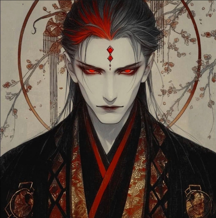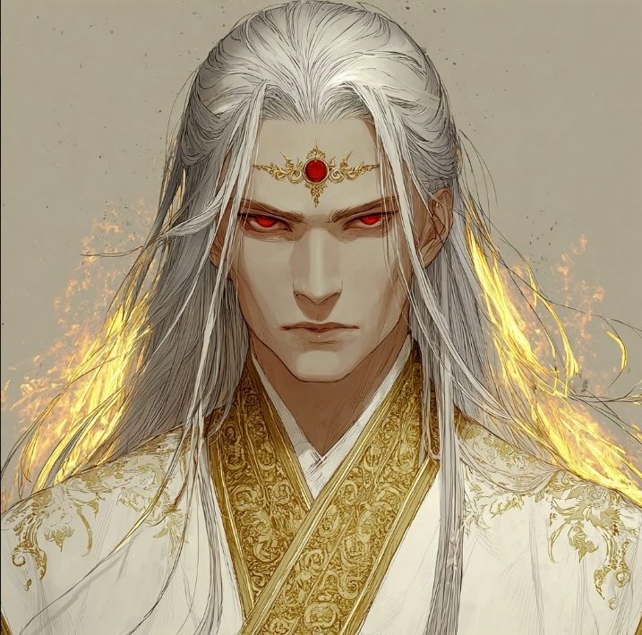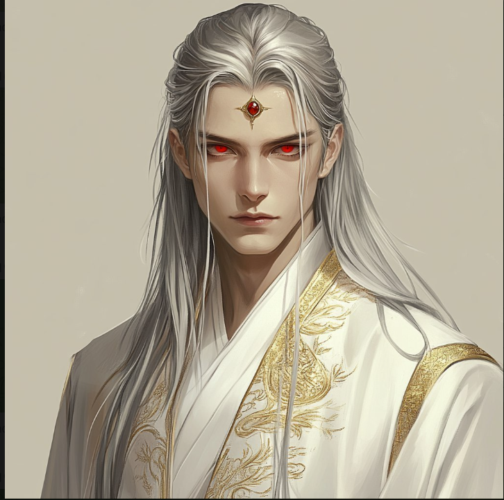 У него длинные седые волосы, алые глаза... И он одет в белое одеяние, расшитое Золотом... В центре его лба алый круг, покрытый золотым ободком, будто бы сдерживая внутреннюю суть...
