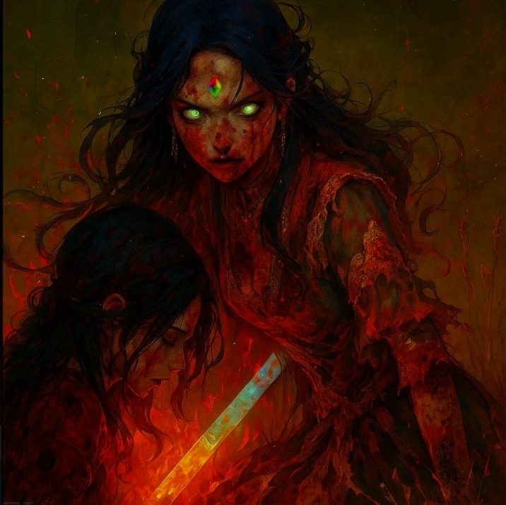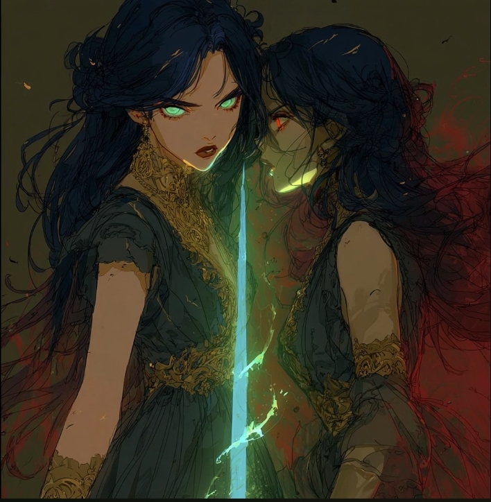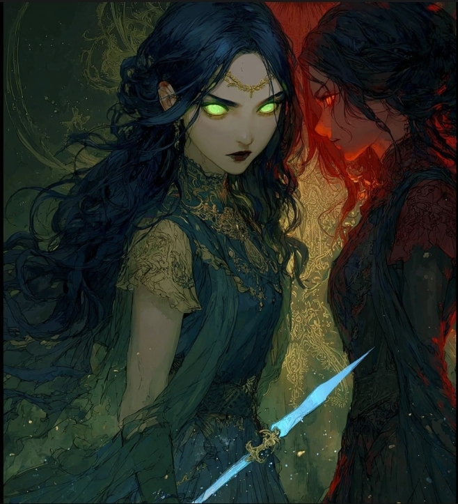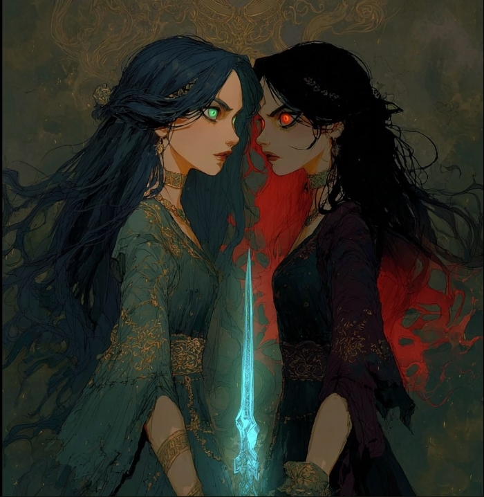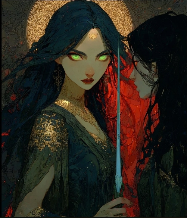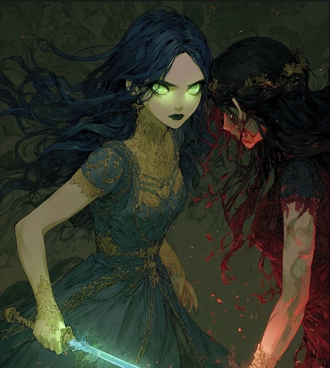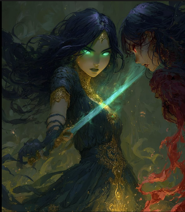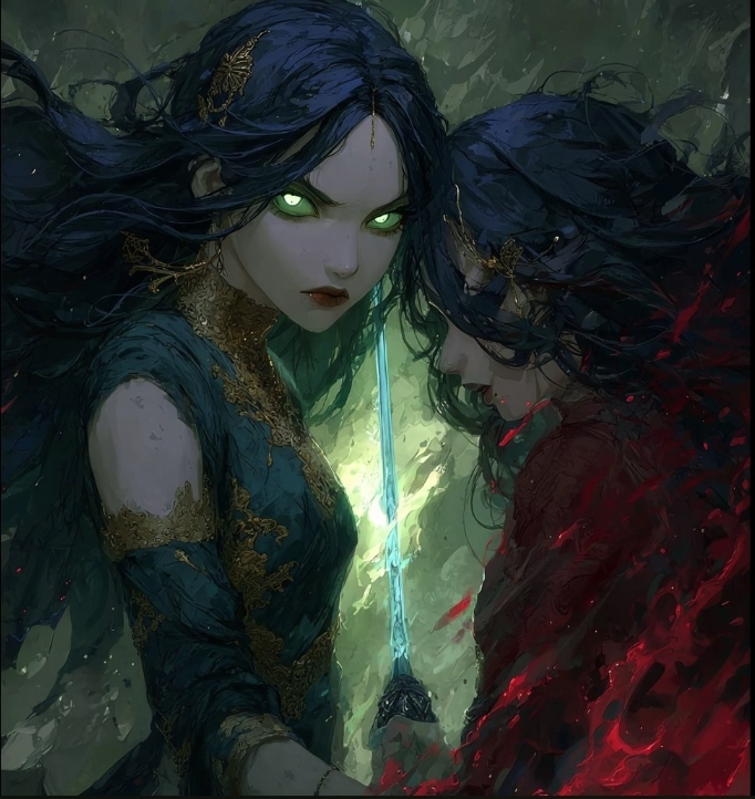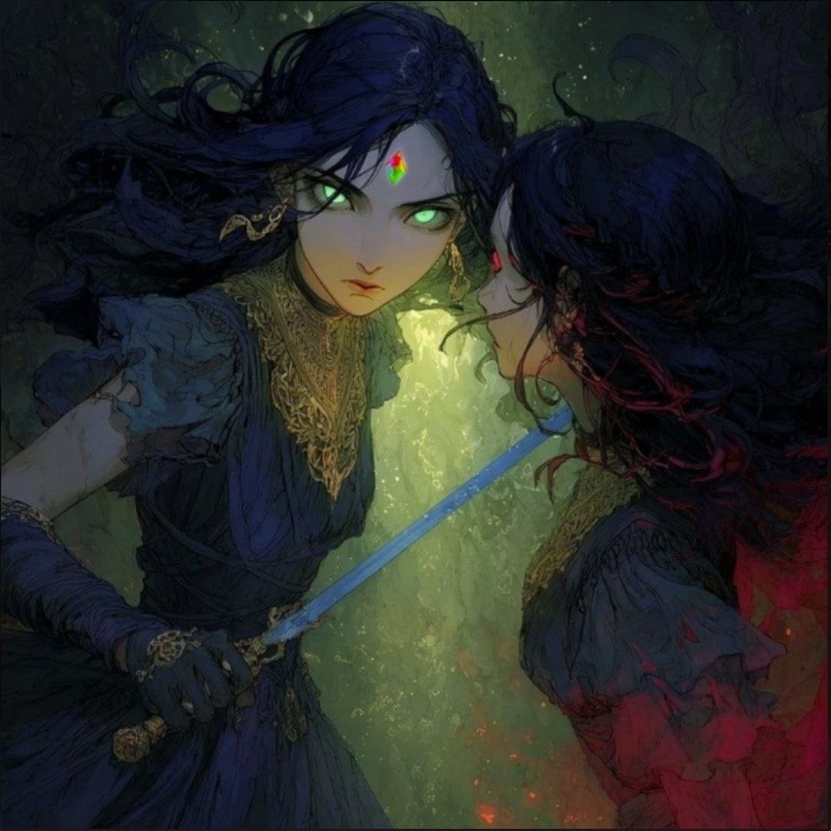 Весайни же смотрела куда-то вдаль. Вспоминала первую встречу с Урд, как та насмехалась над ней. Как та разорила целую Страну. Как та убила Гиалда. Как та едва не убила Илаю и Леонхарда. Как та попыталась убить ее вновь... Сколько зла она причинила. Сколько судеб уничтожила, растоптала... Как погрузила ее в Бездны Отчаянья... Энракьётен порхнул в ее руки сам собой. Проклятый меч пел от таких противников. Он был разумен и щедро делился своими силами и знаниями... От Весайни пошла трехцветная аура... Золото, Грязно-Зеленый, Красный...