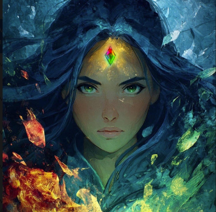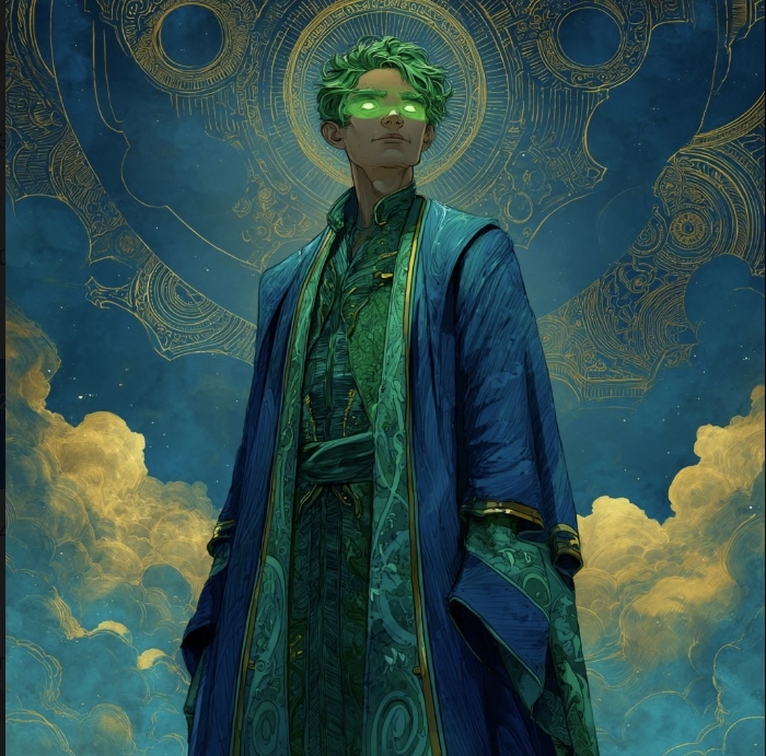 Над принцем Дуэ витала призрачная фигура - молодой мужчина в сине-зеленой мантии с горящими зеленым пламенем глазами. Приятным и мягким зеленым...