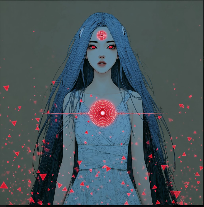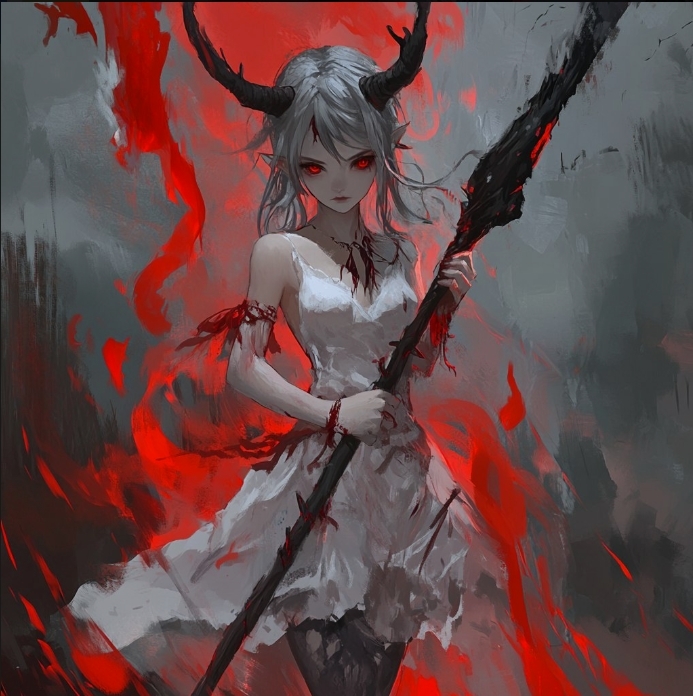 Но когда казалось что беда миновала... Появилась она... Из красного портала в небеса вступила беловолосая девочка в белом... С черными рогами. Она держит в руках огромное - больше ее роста раза в 2 - черное копье. Она равнодушно осмотрела округу...